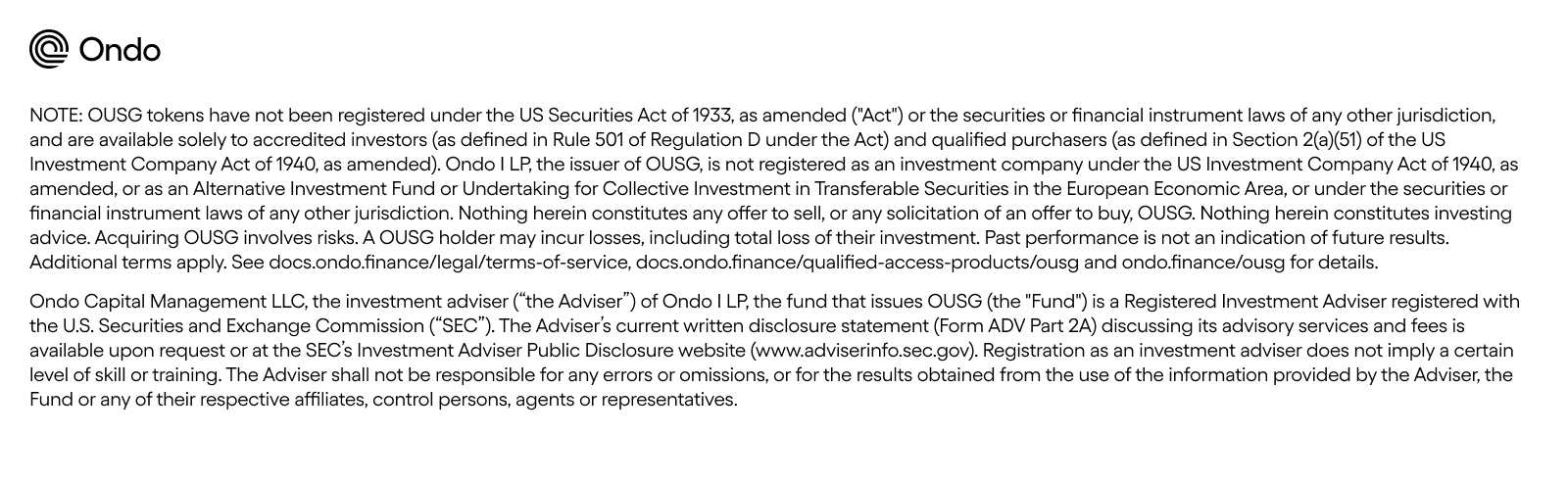 Ondo is a blockchain technology company. Its mission is to accelerate the transition to an open economy by building the platforms, assets, and infrastructure that bring financial markets onchain. For more information, visit https://ondo.finance.