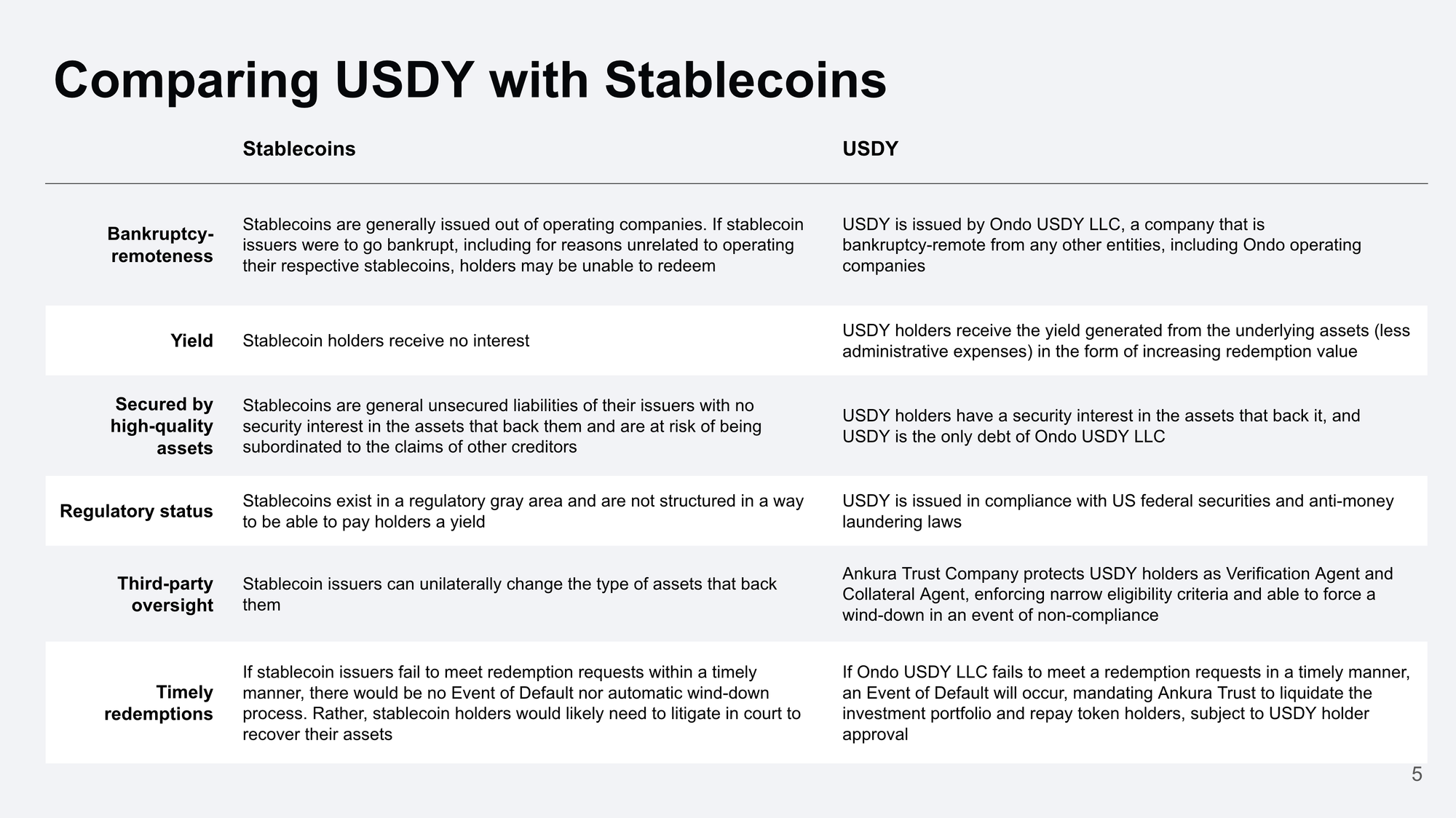 This enables traders to utilize the yield from USDY to offset funding costs, rather than covering these expenses out of pocket. The table below highlights the primary differences between USDY and stablecoins.